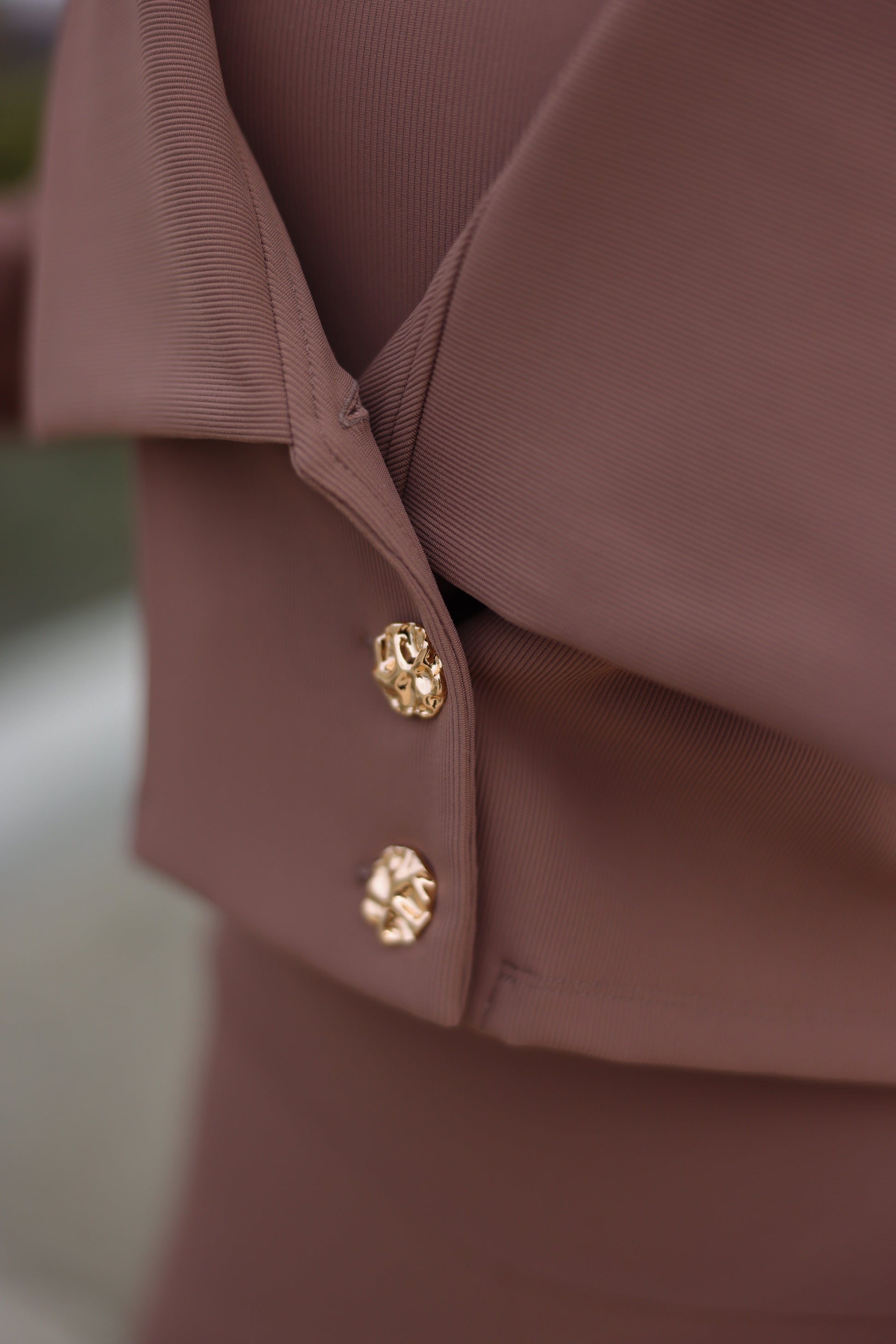 Enyhén bordás anyagból készült, arany gombbal díszített kiskabát.